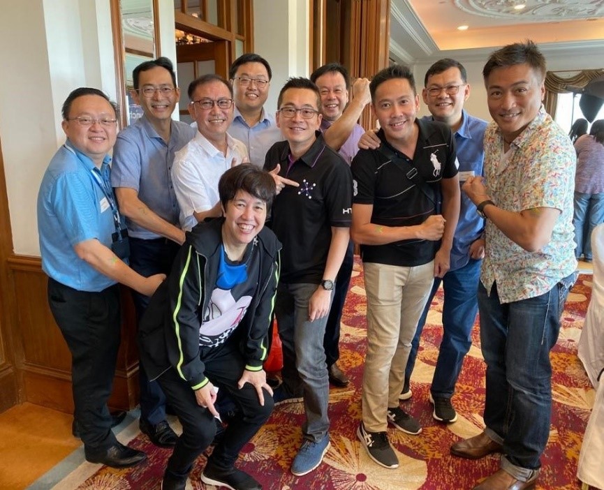 Sor Hoon with fellow HTX leads and senior management – CE Chan Tsan (in HTX t-shirt, standing next to Sor Hoon), DCE (Development) Ng Yeow Boon (extreme right), DCE (Operations) Chen Yeang Tat (in white shirt, next to CE) and ACE (Programme) Tay Yeow Koon (in purple shirt, behind CE) – at the HTX Launch Party on 3 Dec 2019 (Photo: Tan Sor Hoon)