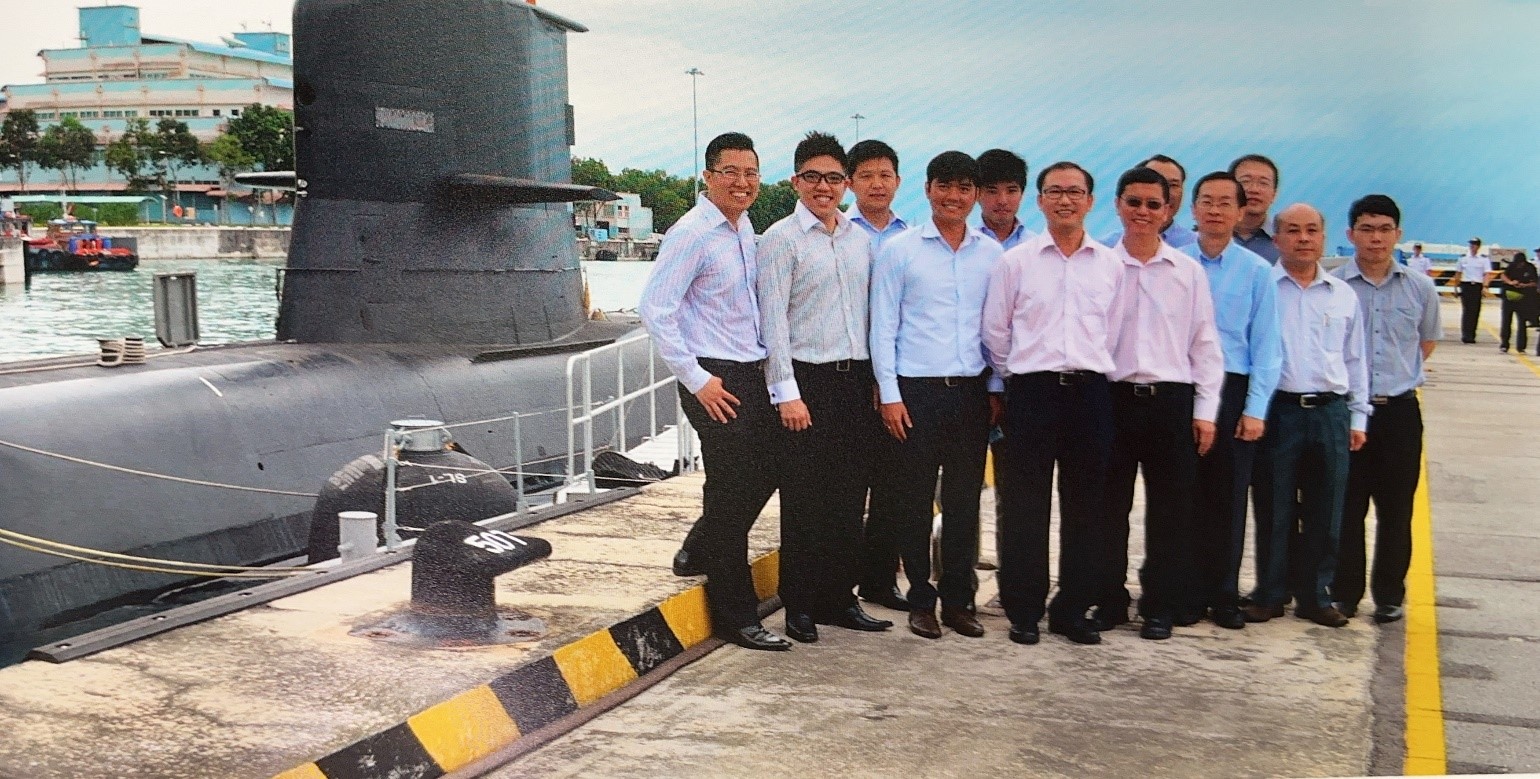Yeang Tat (centre) and his colleagues from DSTA pose beside a RSN submarine. (Photo: Chen Yeang Tat)