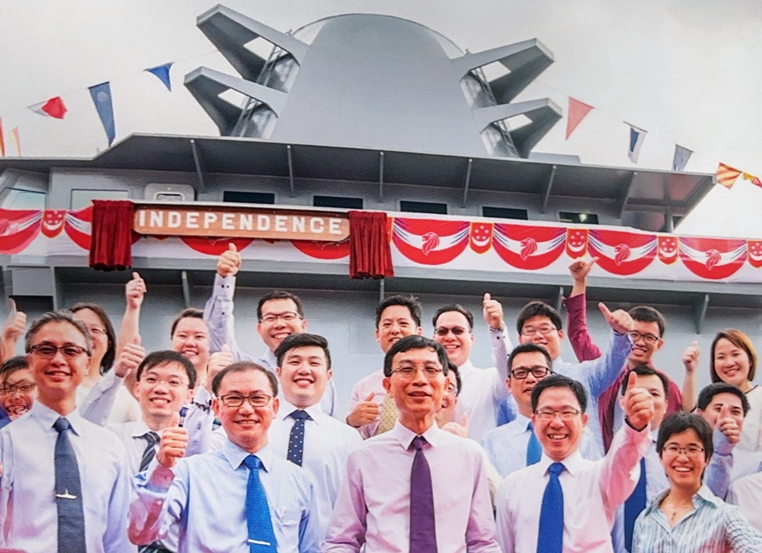 Yeang Tat (front row, second from left) handled systems integration efforts for all kinds of naval vessels, including the RSS Independence patrol craft pictured here. (Photo: Chen Yeang Tat)