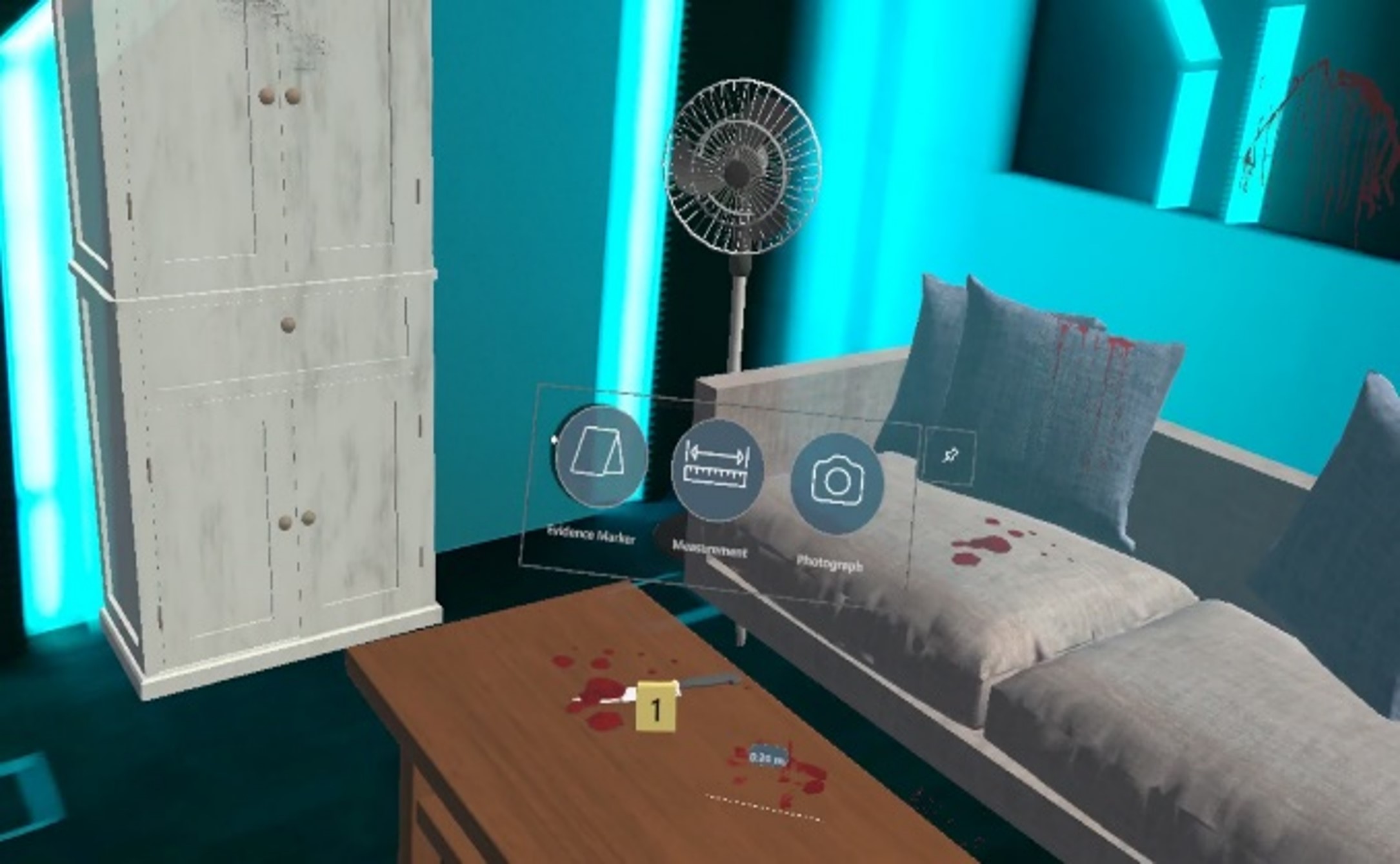 With Mixed Reality, holographic images are projected into the user’s field of view to create realistic virtual crime scenes with enhanced immersion. Training could take place in a mock crime scene with holographic bloodstains easily applied onto different surfaces, eliminating the need to create synthetic bloodstains. Mixed Reality significantly decreases the likelihood of cybersickness and the system also makes use of naturalistic hand gestures so that trainees could interact with the virtual elements of the simulation without the need for hardware controllers, which would have made it difficult for them to hold and use their physical tools simultaneously.