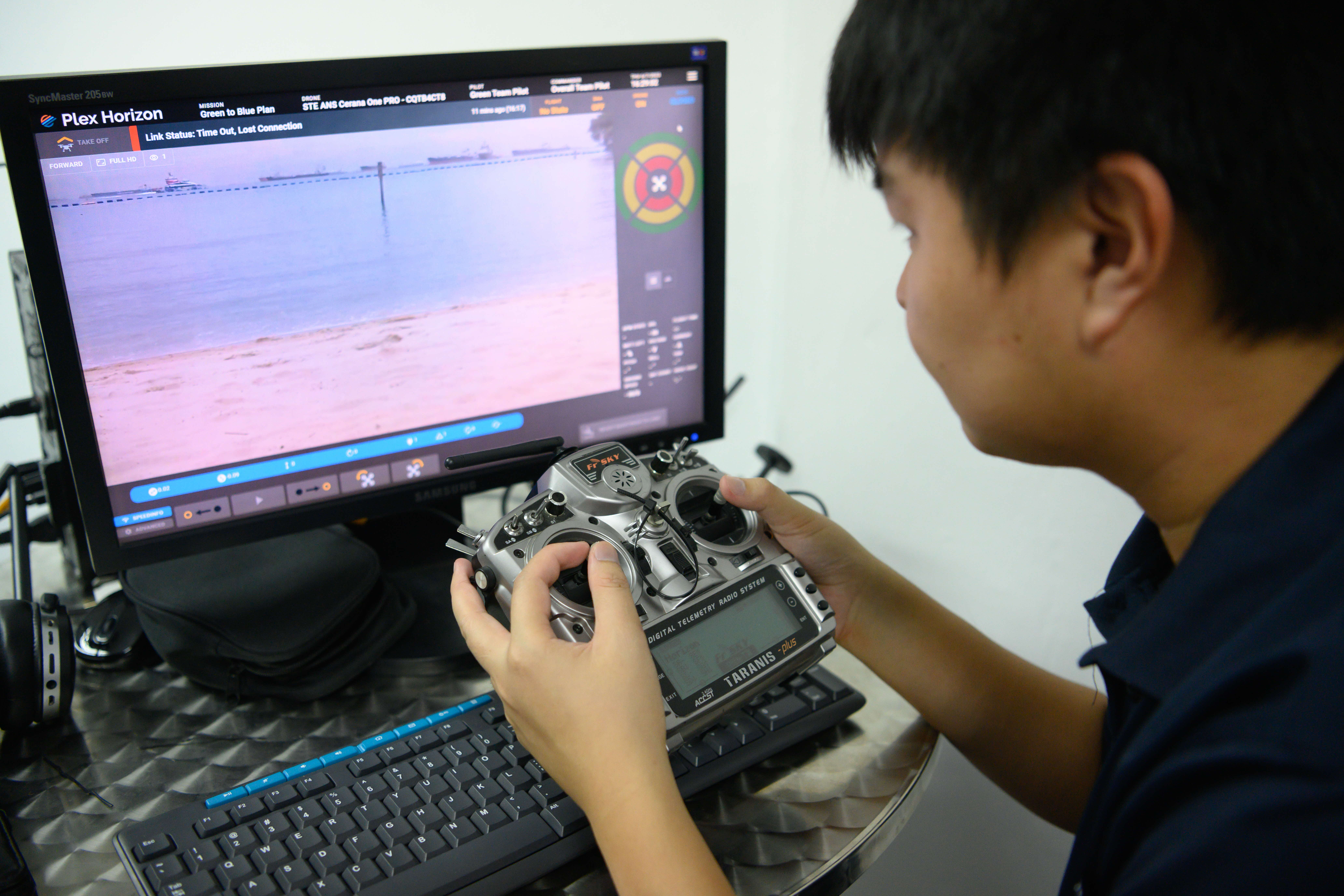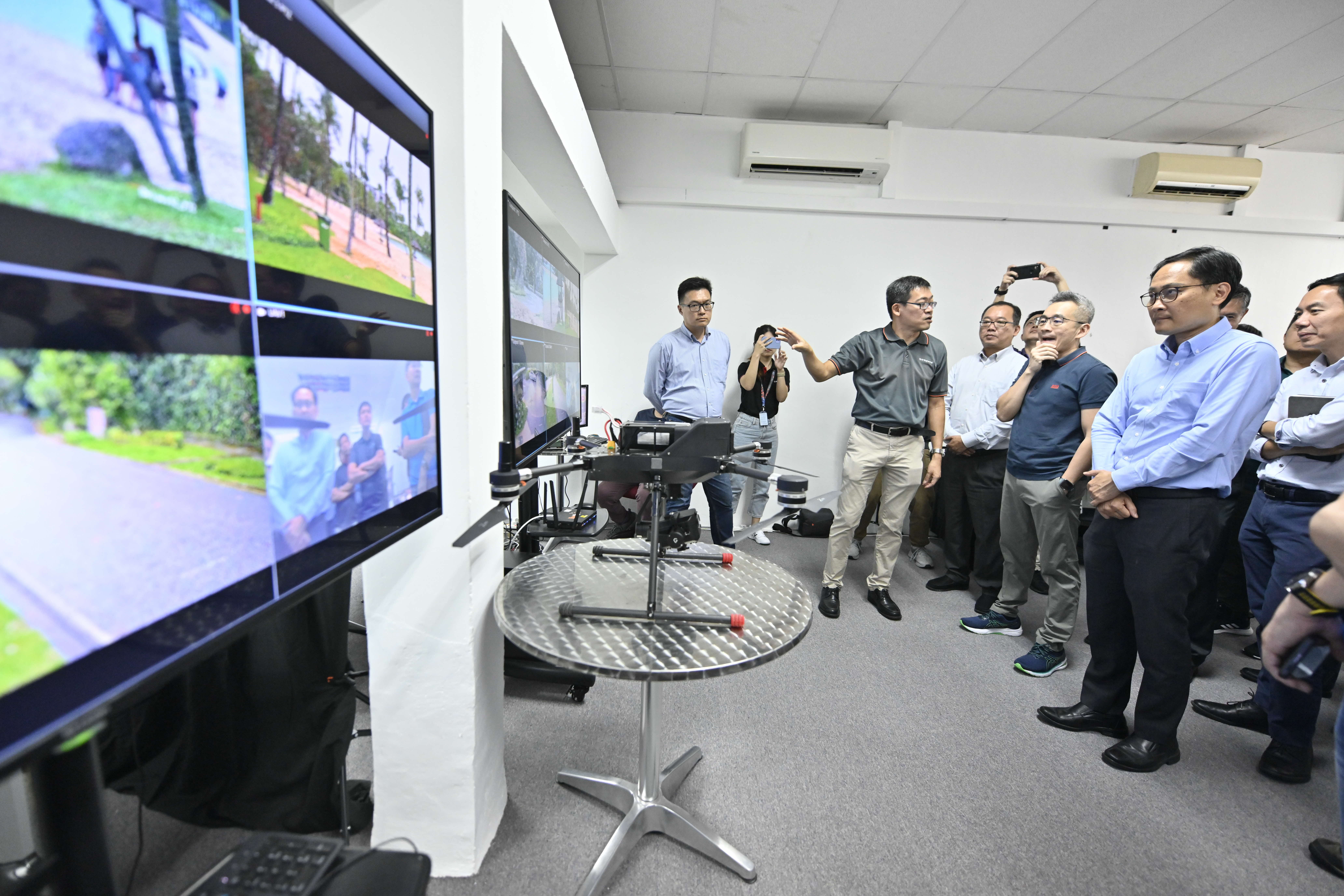 During the demo, the real-time process of transferring drone control after it crosses into a different security airspace was demonstrated. The real-time coordinates and moving path of the deployed drone can be seen on screen. (Photo: HTX)