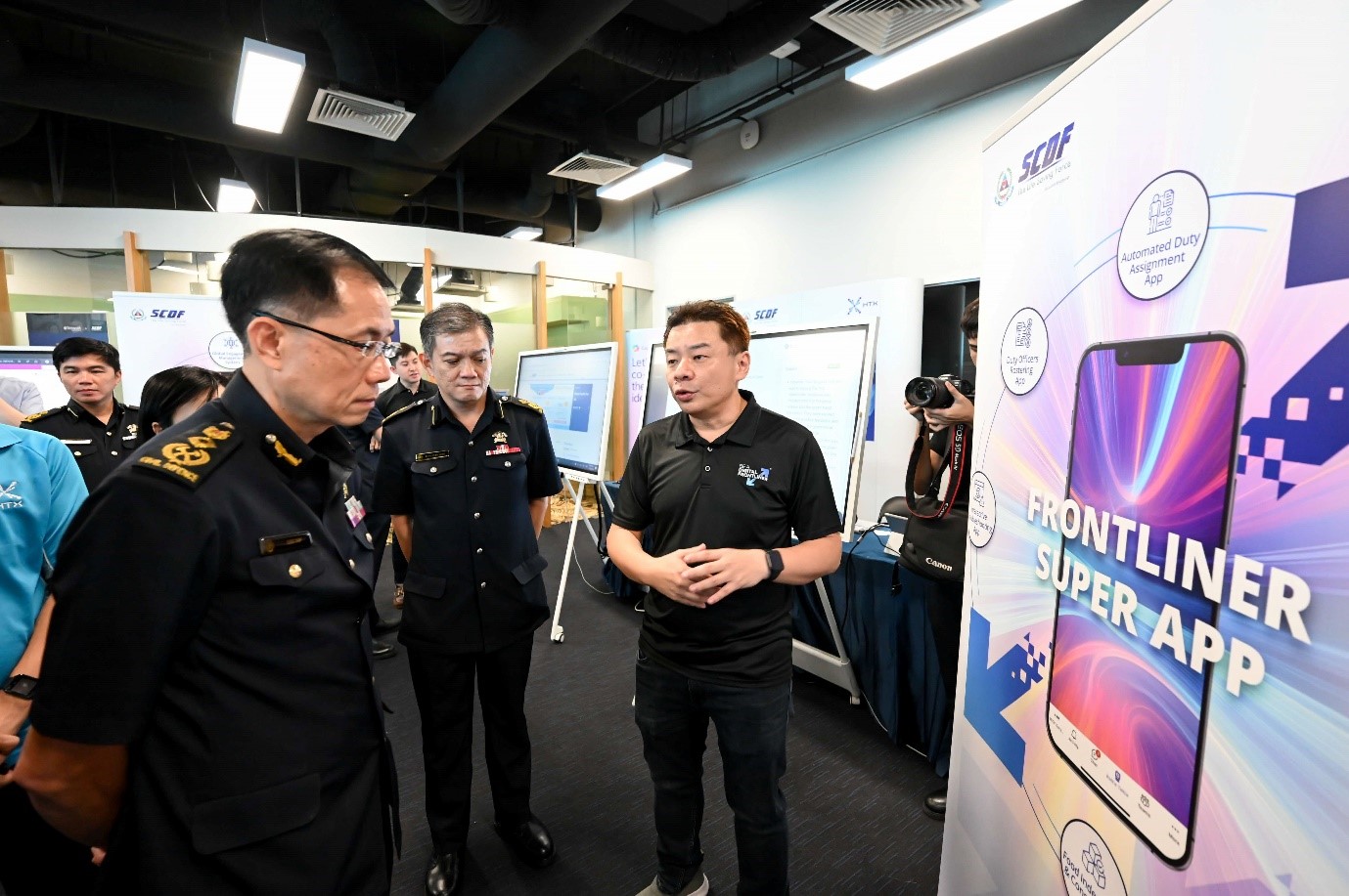 Tan Song Beng, Deputy Director CDPMC, explaining the SCDF Frontliner Super App to SCDF Commissioner COMR Eric Yap and AC Leow Chew Hong, Director Transformation and Future Technology Department (TFTD). (Photo: HTX/CDPMC)