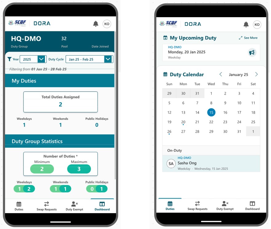 - Duty Officer Rostering App (DORA): Automates regimental duty rostering for non-frontline officers and allows these officers to view and swap their assigned regimental duties.