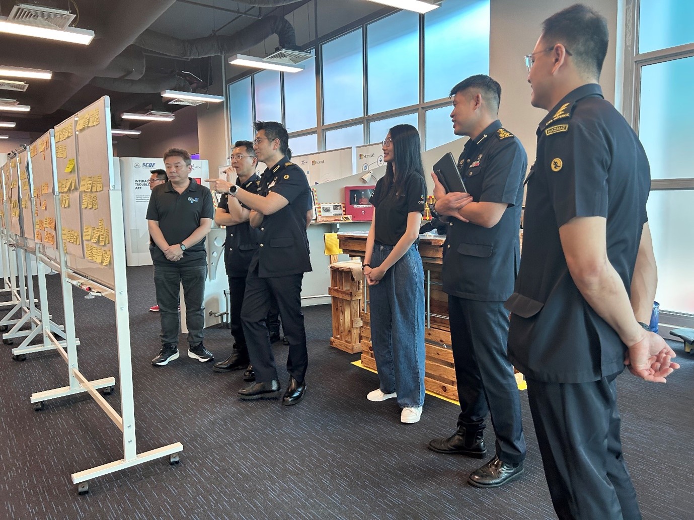 Tan Song Beng, Deputy Director CDPMC, and Natalie Chew, Engineer, Ops Readiness & Case Management, CDPMC, at a workshop with SCDF DC Daniel Seet, DC Ling Young Ern and SAC Alan Chow. (Photo: HTX/CDPMC)