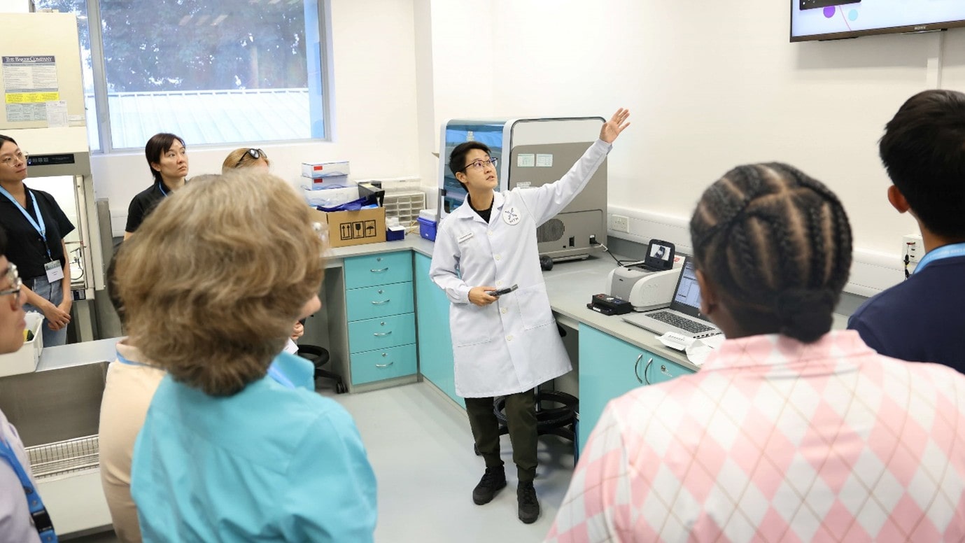 Fadzilah Salim, Senior CBRNE Scientist, speaks to guests of the event in a lab. (Photo: HTX)