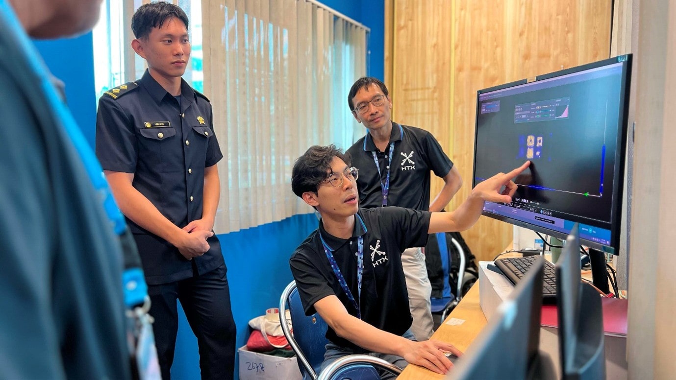 Cheung Ka Kei (seated), Lead CBRNE Engineer, Threat Scanning Technology & Analytics, and Dr. Goh Ho Wee (right), Deputy Director, Threat Scanning Technology & Analytics, explain their latest research in the use of cosmic x-ray technology in cargo scanning. (Photo: HTX)