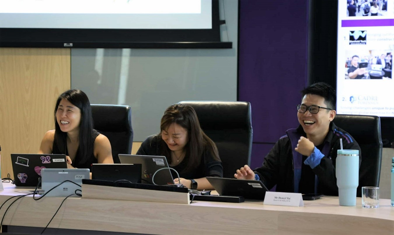 Denzyl Tai (right), Head of HTX’s Centre of Expertise (CoE) Hub, presents HTX’s three-pronged R&T approach. (Photo: HTX/Dorcas Yang)