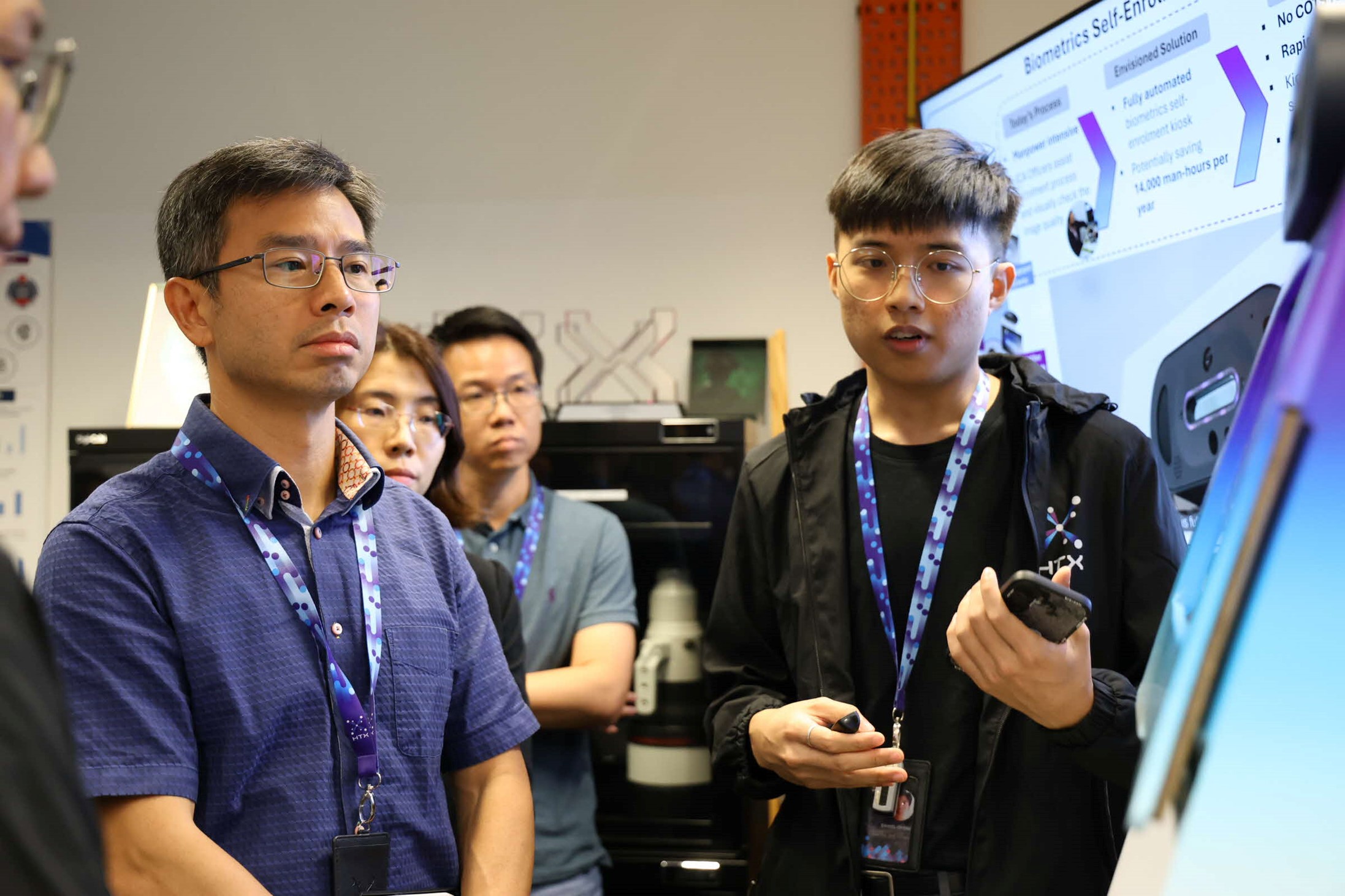 Daniel Cheng (right), an engineer from the B&P CoE, presents the Biometrics Self-Enrolment Kiosk prototype, which aims to automate Immigration and Checkpoints Authority’s (ICA’s) officer-assisted biometrics enrolment processes. The solution won the Public Service Science, Technology and Engineering Innovation Challenge (STE IC) Merit Award in 2024. (Photo: HTX/Janna Giam)