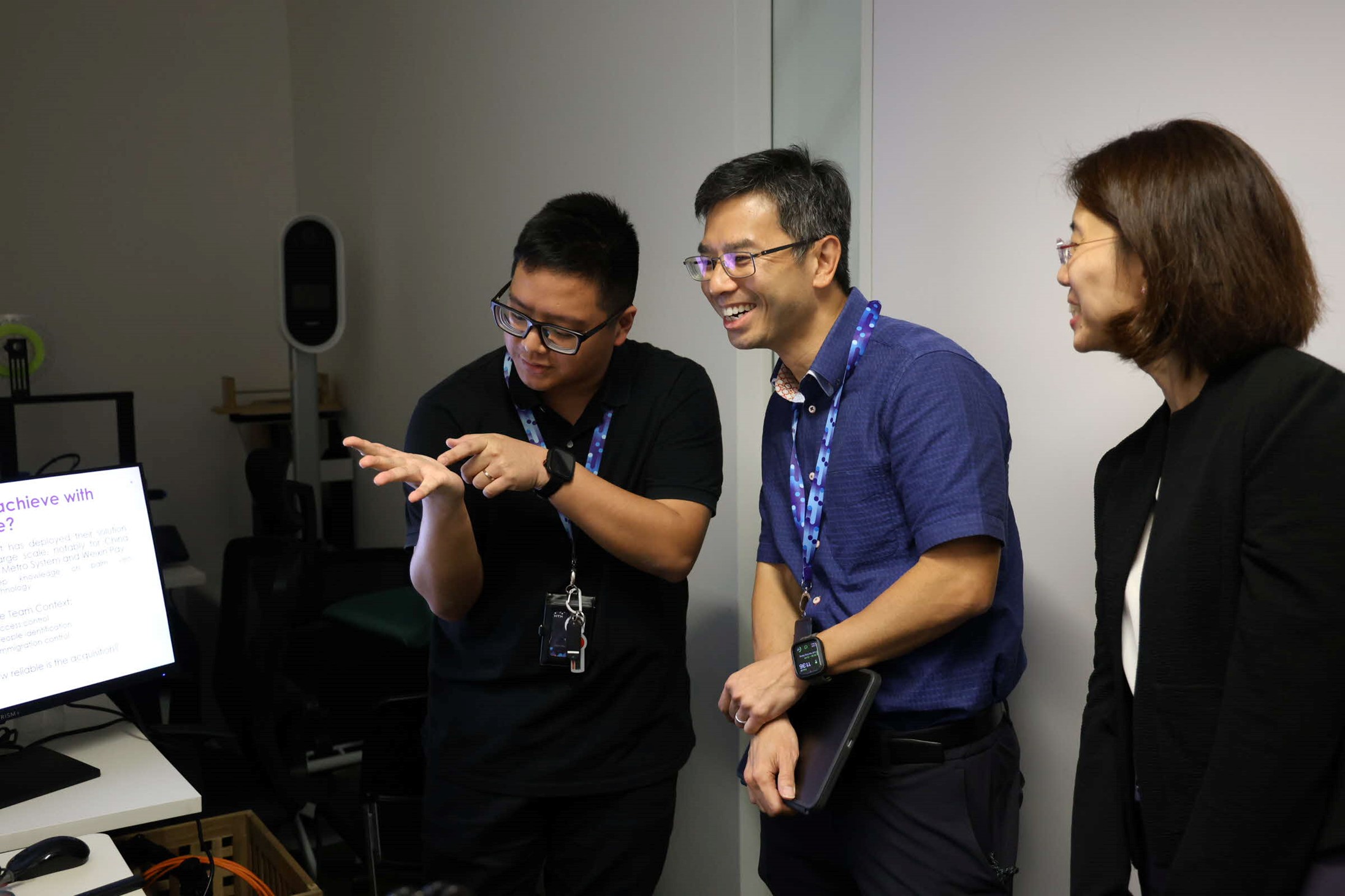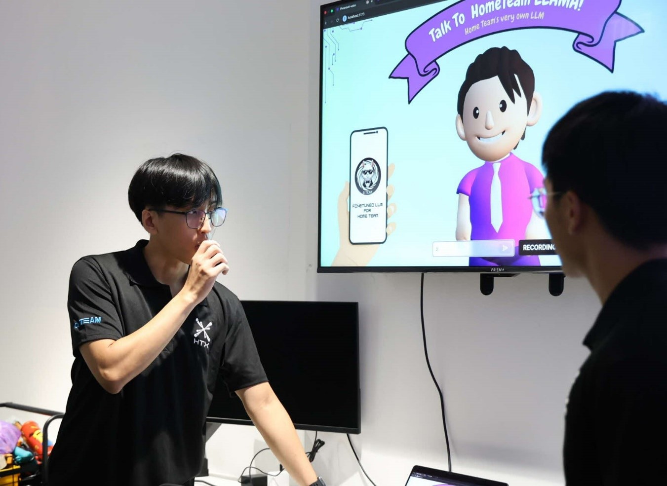 Q Team engineer, Lam Wen Jett (left), speaks to the “HomeTeam LLAMA” – an in-house fine-tuned LLM that answers anything Home Team-related – in Q Team’s lab. (Photo: HTX/Janna Giam)