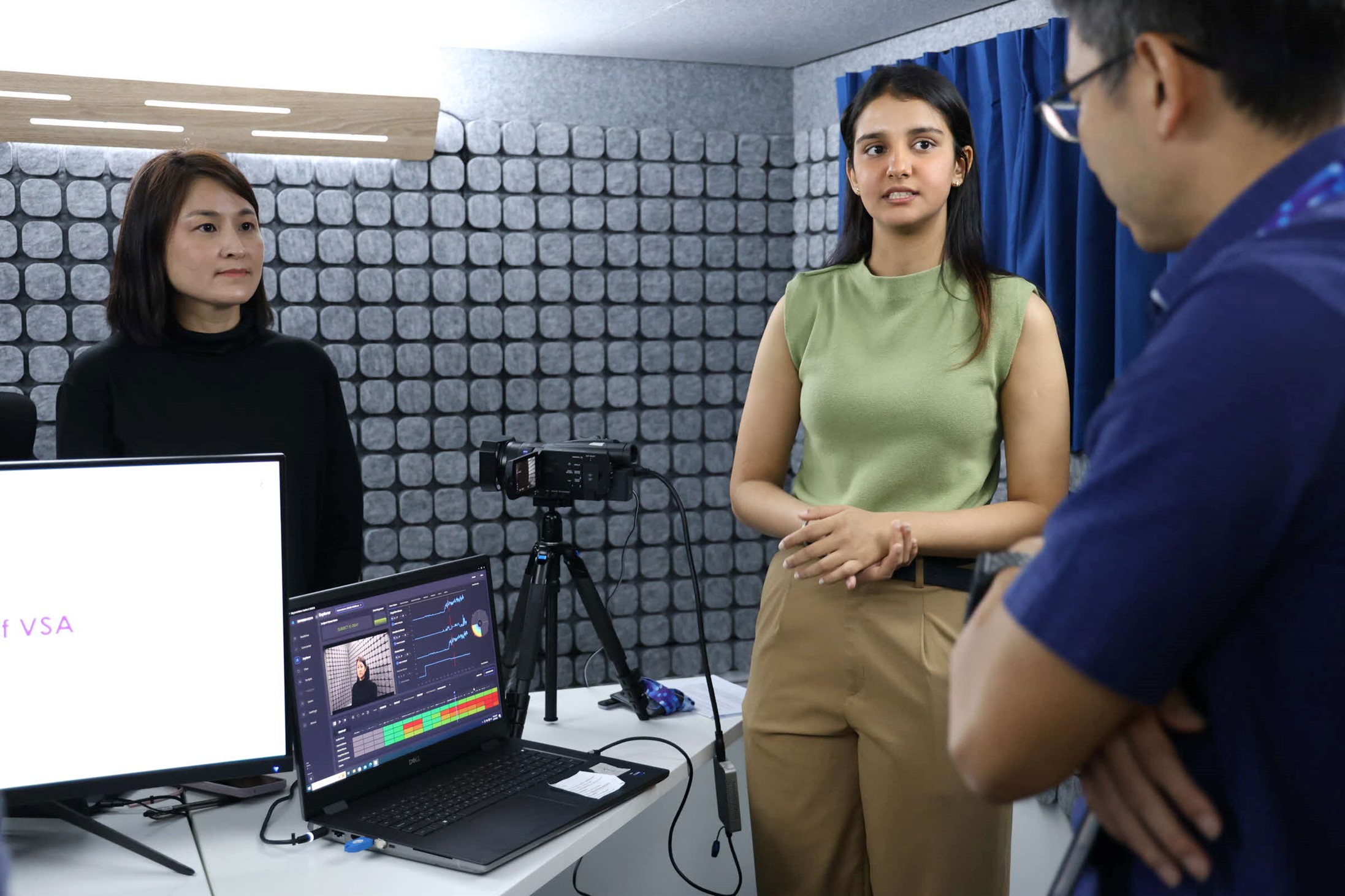 B&P engineers Wong Yu Zhen (left) and Simran Kaur (right) address questions after a live demo of the Visual Stress Analysis tool, which measures the emotional and cognitive stress levels of a subject in an interview setting in a contactless manner. (Photo: HTX/Janna Giam)