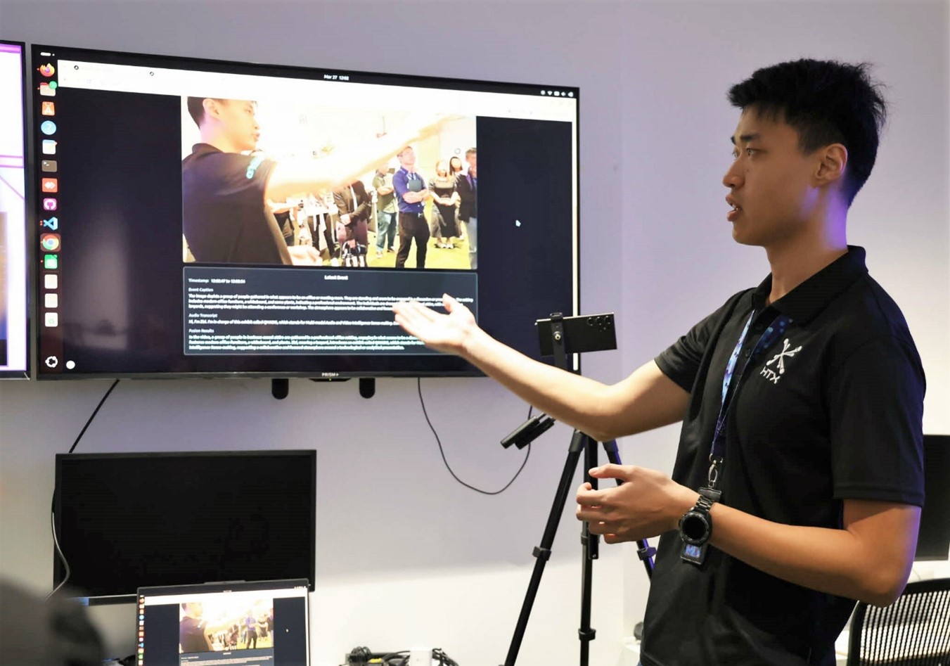 Q Team engineer, Lin Zixing, presents Q-MAVIS (Multimodal Audio and Video Intelligent Sensemaking), an advanced video understanding platform developed by Q Team. (Photo: HTX/Janna Giam)