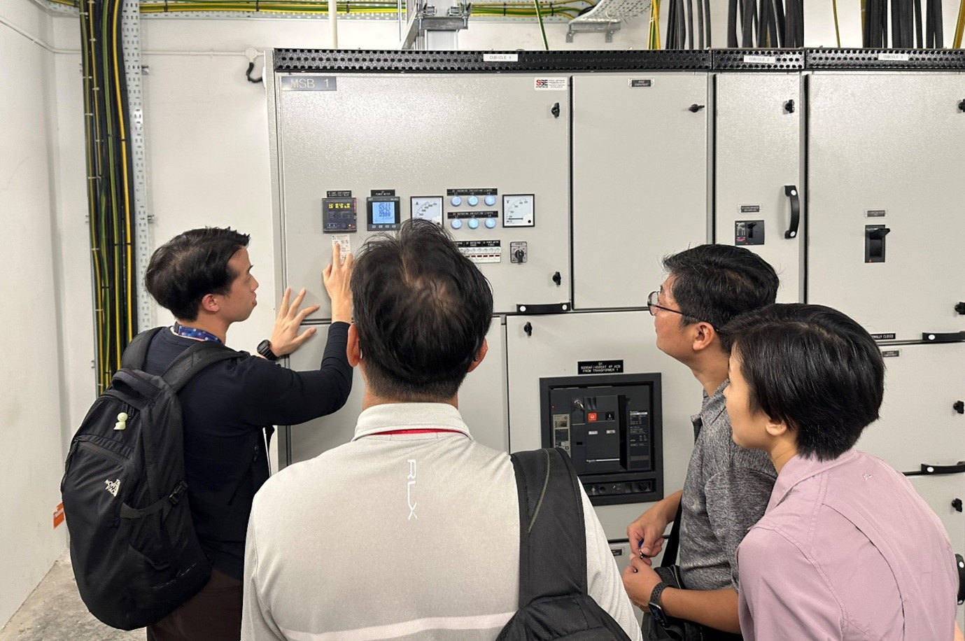 Building & Infrastructure’s Electrical team inspecting a meter installation with users from the Singapore Police Force. (Photo: HTX/Toy Jia Ling)