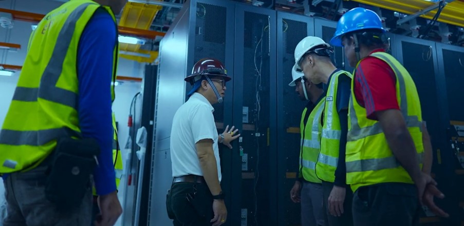 An Xponent from ICT Infrastructure leads an on-site inspection of equipment at a Home Team data centre. (Photo: HTX)